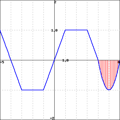 B. If the vertical red shaded area in the graph has area \(A\text{,}\) estimate: \(\int_{-4}^{6} f(x) dx =\)