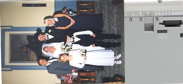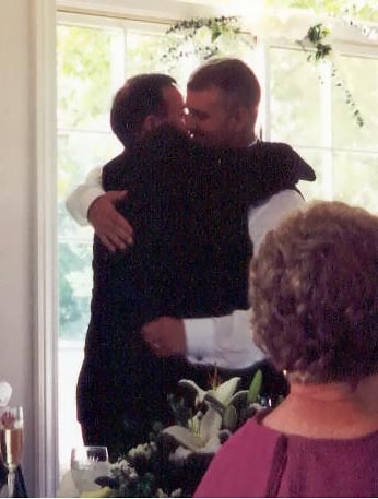 Vicki and Paul are the family conservationists, choosing to conserve space whenever and wherever possible, as this picture shows... Vicki and Paul were married on Saturday, September 2, 2000.. Vicki Vicki & Sonja Paul, apparently confused, and Chad Three French Dudes..L to R: Xavier, Jean-Damien and Elyse |